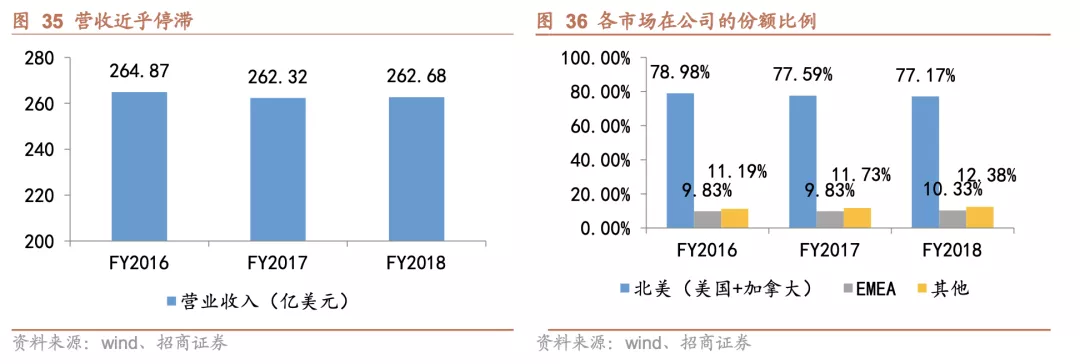 北美收入增长停滞,致使基本面弱化。2017年起公司股价进入下跌通道,根源在于基本面的弱化,这在财报上主要体现于收入增长的停滞。2016-2018年间公司营业收入维持在260亿美元水平,基本没有增长,甚至2017年同比出现倒退。而北美市场在公司总份额中长期占据绝对优势(超过四分之三),故而收入停滞的症结很大程度上出现在北美市场。