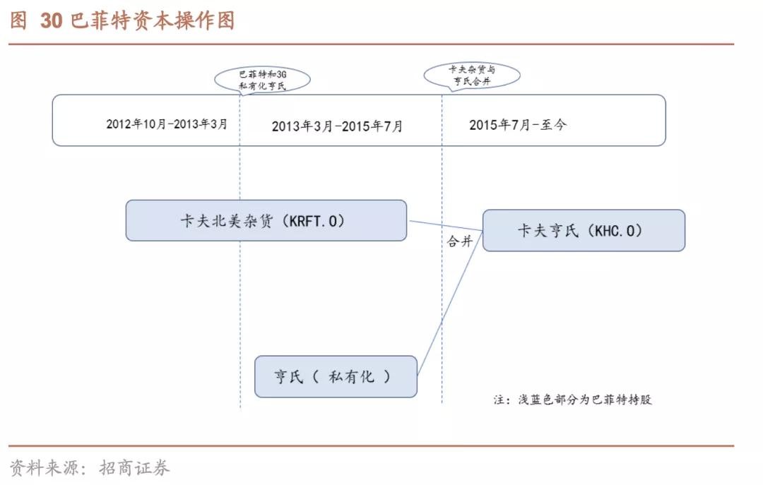 延续3G资本的并购之路。而3G资本赚取的不是外生价值,而是内生的改善价值,这就要求3G资本不断地并购、改善、再并购、再改善,在经营完亨氏后3G资本需要寻找下一个目标——必须是公司品牌不错但是近年增长不强的可改善公司。恰好巴菲特在合并前已经同时持有卡夫北美杂货、亨氏双方的股份,并且相信双方的长期投资价值,选择合并卡夫北美杂货也就成了一个自然而然的选择。