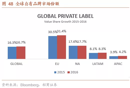线下零售商自有品牌质量相似、价格更低。对比像卡夫亨氏这样的老牌厂商,零售商的自有品牌具有相似的质量但是更为低廉的价格。据尼尔森《自有品牌的兴起与再兴起》报告,2017 年自有品牌在美国销售额增长了10%左右。与之相比,全国性的大品牌的销售量和销售额分别下降了1%和0.3%。2017年美国超市等大众渠道的销售额为3050亿美元,其中零售商的自有品牌的销售额达到了549亿美元,比2016年上升了9.1%。2018年最后三个月,美国的自有品牌食品和饮料、化妆品及其它消费品的销量增长4.3%。相比之下,美国前20大品牌的销售额仅增长1.2%。在北美和欧洲,自有品牌的市场份额都非常高,根据2016年统计数值,在欧洲和北美市场自有品牌的市场份额分别达到了31.4%和17.7%。强势的自有品牌也使得零售商在与供应商议价时具有更大的优势。