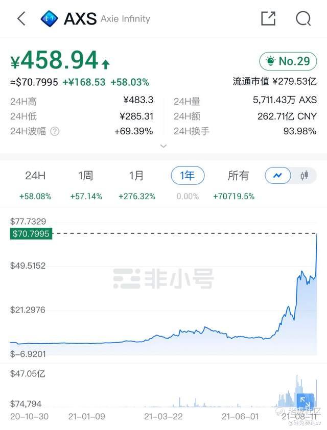 用户的疯狂增长带来了币价的上涨,在今年5月-7月,整个币圈哀嚎之际,AXS却逆势上扬,打破了整个币圈随BTC和ETH大盘波动的传统局面。