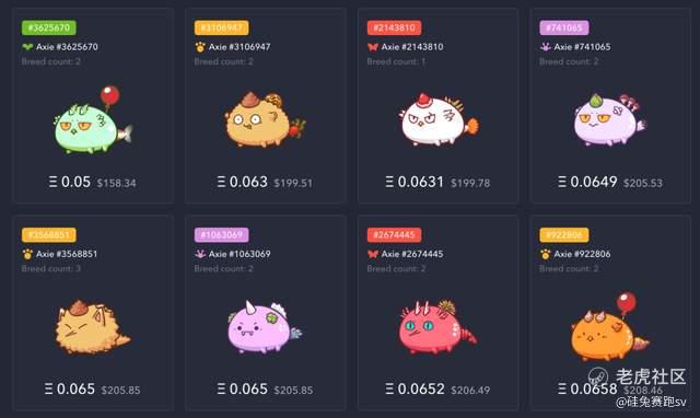 相比于普通游戏里的宠物,NFT小宠物最大的特点就是它具有独特性,如图中在售的部分Axies,每只Axie都有自己的专属编号,它们的长相和性能不尽相同,在市场上也有不一样的标价,这点跟人类很像,每个人都是不一样的,拥有独特的身份证号码,在社会中有不一样的价值。