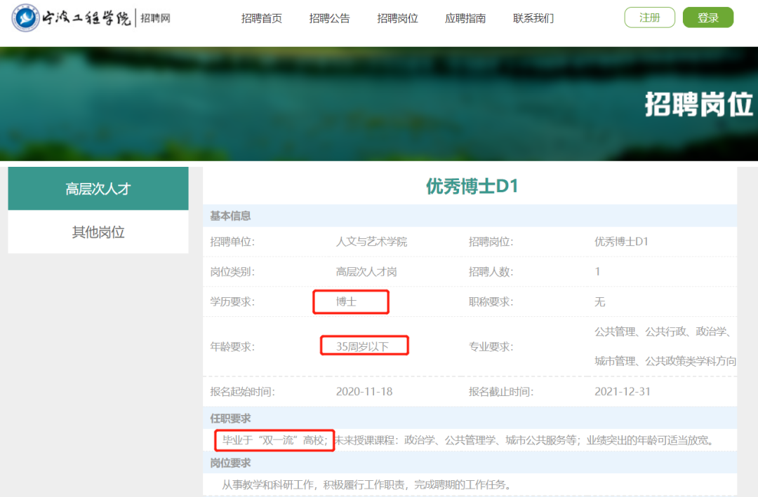 我从宁波工院的官网找到了他们2021年的招聘公告,如果你是一名国人,想进入该校的经管学院工作,那么至少要满足以下三个条件:博士学位、35周岁以下,双一流高校毕业。