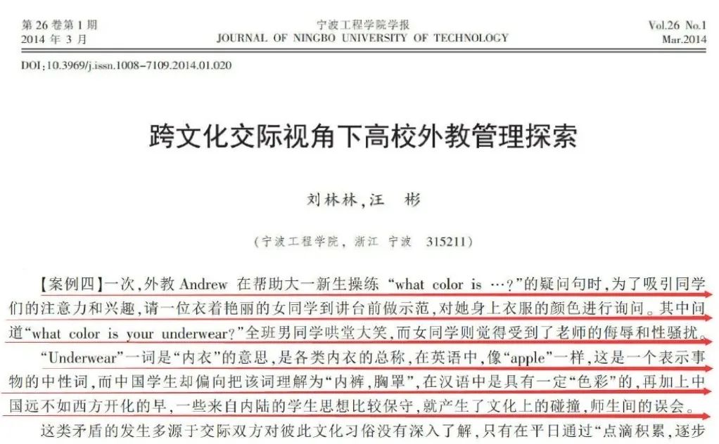 在这个论文中举了一个案例,男外教询问女学生:你内裤的颜色是什么?女学生感到受到了骚扰和侮辱,而刘林林主任则认为,这只是因为中国女学生思想保守导致的。