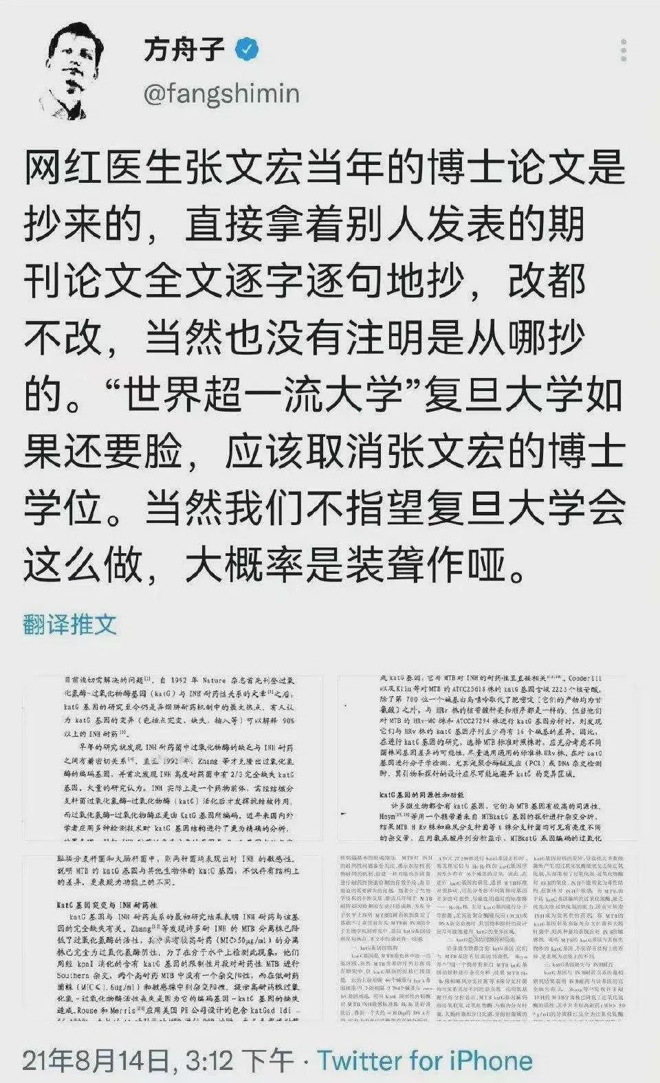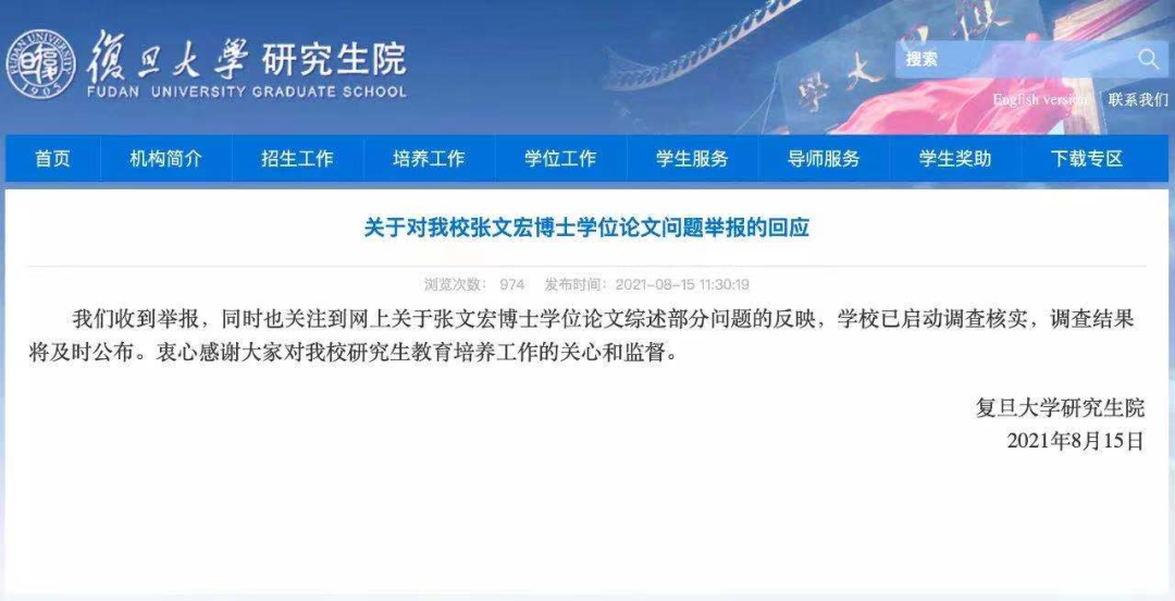 就连复旦大学也抵不住舆论发布了“已启动调查核实张文宏博士学位论文综述部分问题”的网络通告,回应网络上对张文宏的举报,已经进行调查程序。