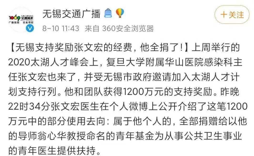 去无锡参加才峰会,无锡市仅给予张文宏团队1000万元项目支持经费,主要用于临床科研与技术创新等,其中10%用于团队成员补助。