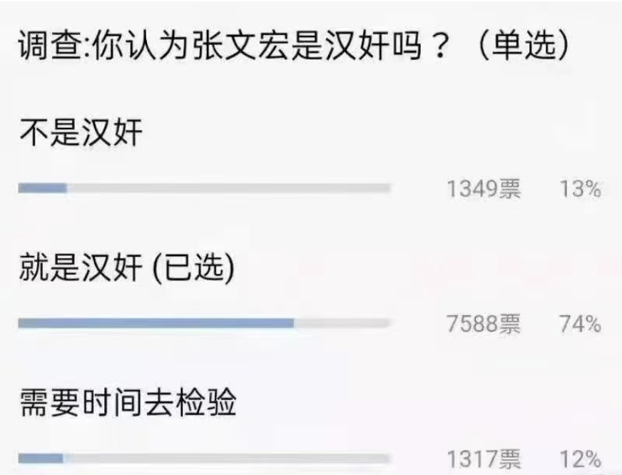 网上竟然有这样一个投票,其中有74%的人认为张文宏是汉奸。