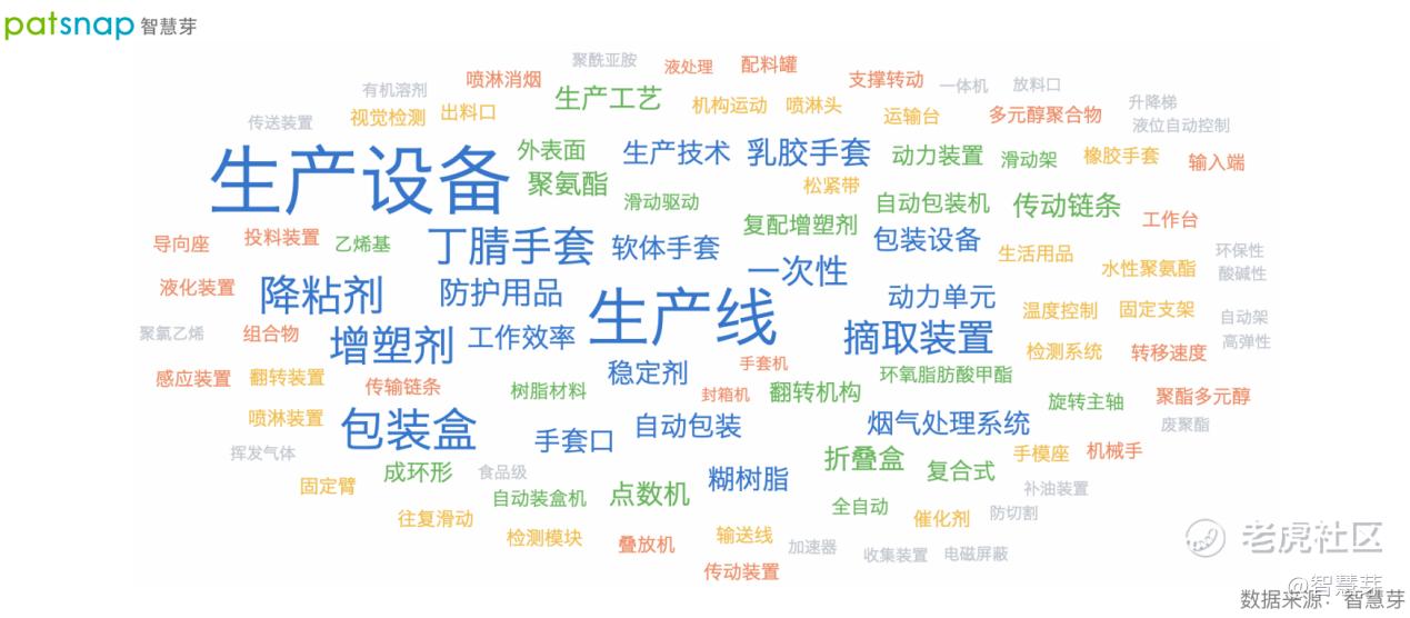 从上述专利文本分析可知,蓝帆医疗近几年的专利布局主要集中于生产设备、生产线、包装盒、丁腈手套、增塑剂、降粘剂等专业技术领域(详见图2)。