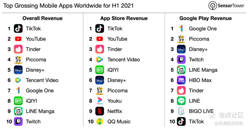 图:2021年上半年移动APP账单全球排名