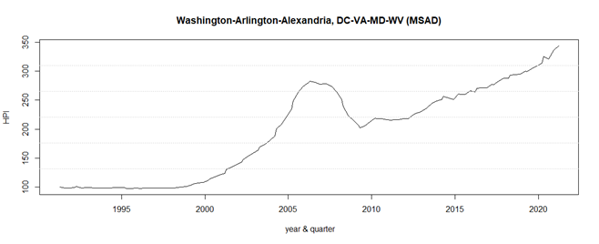图2是首都华盛顿都市圈的房价指数。解释一下,华盛顿这个城市本身很小,核心区域可能和中国发达地区的一个县城差不多大。而华盛顿都市圈包括了佛吉尼亚州的北部,马里兰州的西南部,甚至西佛吉尼亚州的一部分。