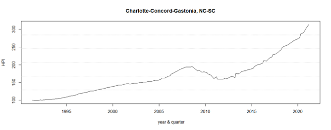 纽约和华盛顿都是比较特殊的城市。我们来看一个比较普通城市的房价指数--位于南北卡罗来纳州之间的夏洛特都市圈。从图3中我们可以明显看出,在次贷危机以前,夏洛特的房价指数涨幅不到2倍。这明显低于纽约和华盛顿房价指数的涨幅。但是夏洛特房价指数在过去的10年里上升很快。早了2020年末,指数达到了313.82,基本追上了纽约的涨幅。