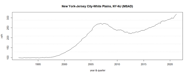 我们这里不讨论指数的算法和优劣。只是用FHFA的房地产指数来说明一些问题。图1是纽约都市圈从1991年到2020年的房地产价格走势。1991年1季度是指数的起点。其值为100点。到了2020年4季度,上涨到了319.40点。也就是说,在过去的30年内,大纽约地区的房价上涨了3.2倍。计算一下,年化收益率为3.95%。