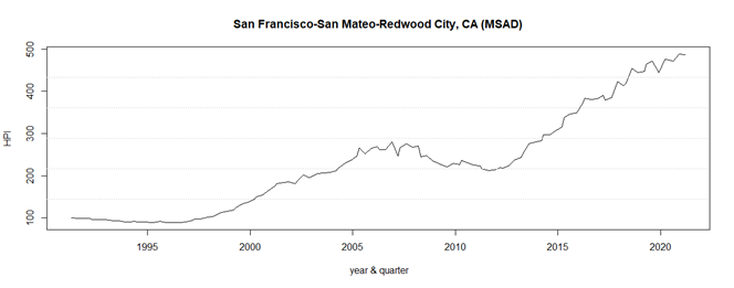 图4一看就和前面的3张图不一样。2020年末,旧金山都市圈房价指数为486.75。在过去的30年上涨接近5倍,年化收益率为5.42%。这个涨幅显著超过东海岸。