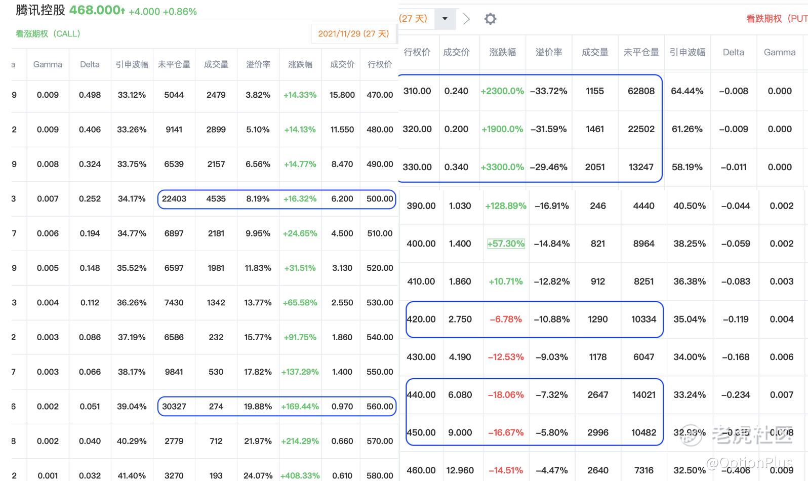 我比较关注的就是腾讯、美团、快手、小米。股王腾讯不用说,基本上它的动向对整个恒生科技有比较明显的指导作用,我经常会看看腾讯的期权有没有大单异动,这是港股为数不多能有期权成交量异动的票,很多持有股王的人会做领口策略,这些单子会出现在期权异动上。再看看目前持仓量大的call&put价格区间,比如,我刚看腾讯11/29的call 在500 560持仓达2万和3万,而put这边在420、440和450是超过1万,但最突出的是310的put,高达6万持仓。这种当月到期价格非常远的put大概率是正股持有者在做保护。$腾讯控股(00700)$ 所以我选择卖了420的put,还有一个原因是420-430是一个前面比较强的支撑。不得不想的是,下周腾讯要发财报了。我看互联网怪盗团发了一个文章说,这是最无聊的一个中概股财报季,大家都不会有华丽的增长,大家都会无私分享收益。既然市场都预期到了,大概率财报也不会怎样。420这个价格,我觉得还是妥妥,勇一点可以往440的卖,个人觉得问题也不大。如果真的行权买到应该算抄底,然后做500的波段。我上一把就是500波段卖出的。