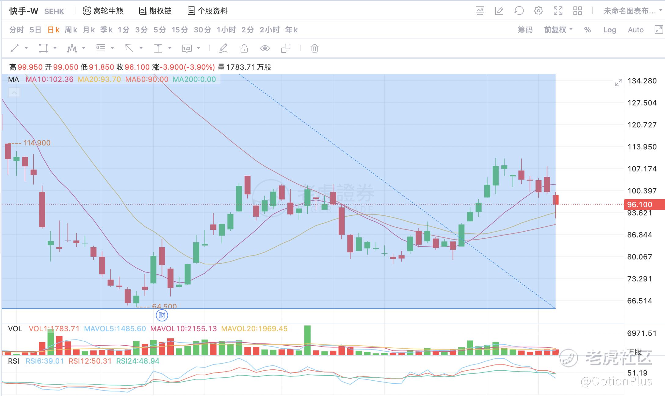 美图图形上是这轮非常强势的反弹股,从183到297反弹了超过60%,才遇到阻力没有突破回落。我把卖put的单子下在了240我自己觉得比较安心的价格,给大家一个参考。接着说$快手-W(01024)$ ,我个人对这个公司没有任何偏好,也不用。只是它是今年上市的标杆,也是一个恒生科技顶的标识,所以一直在关注。之前做了85-100的反弹,主要是出现了明显十字星,而且确实跌的很多反弹需求明显。快手更像是一个恒生科技的情绪指标,但它期权成交量更小了,个人觉得目前还有反弹的需求,Q3电商业务其实很不错,如接盘85左右差不多,目标可能在115左右,就是上市发行价,如果接不到也无所谓了。