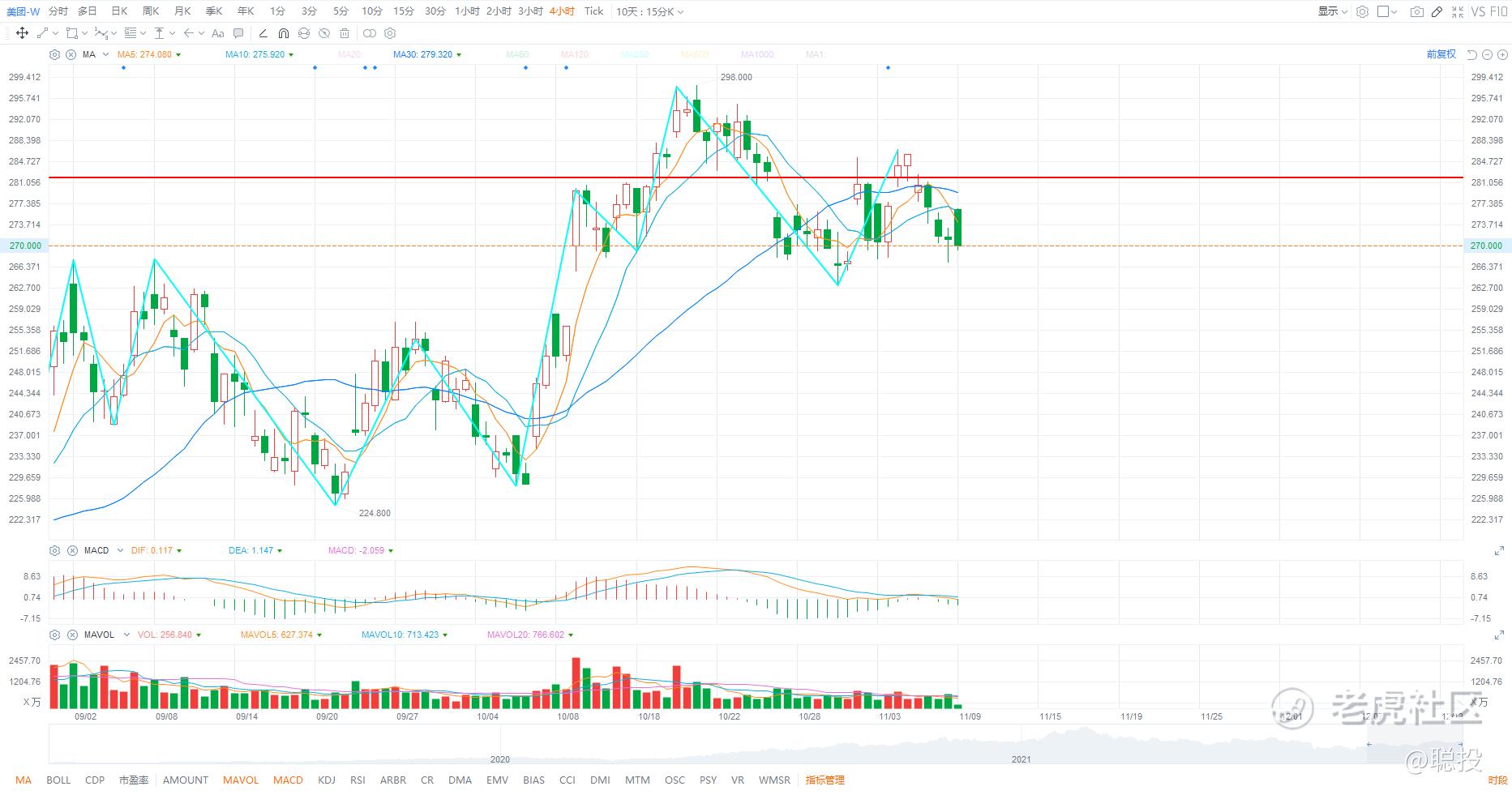 1、$美团-W(03690)$ (长线):美团目前来了个高开低走,不过问题不大,这个地方阿聪还是看它震荡为主,做长线的随时都可以建仓,做短线的还是避而远之为好。