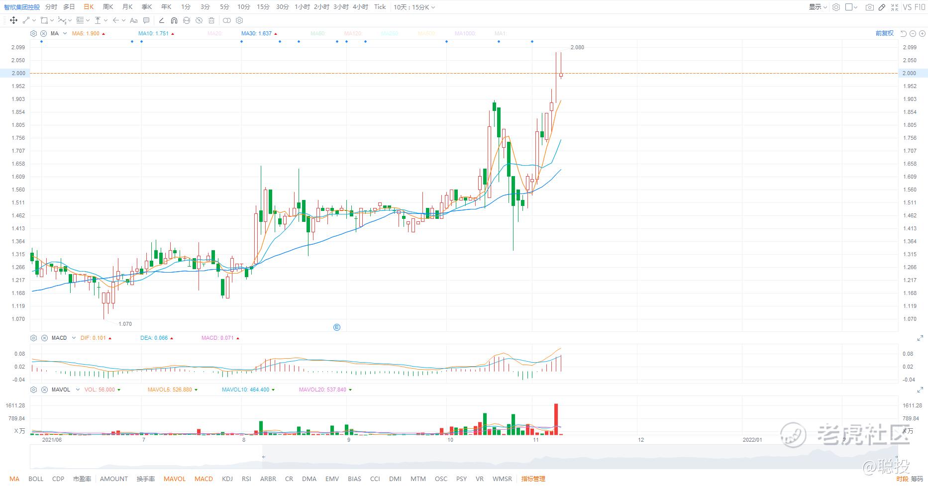 2、智欣集团控股(中线):昨天建仓了这个票做中线,有些股友问我是不是有些追高了。其实追高这个问题阿聪认为只会出现在短线操作里面,对于中长线操作基本不存在追高的问题,你现在看起来是高点,但是当公司业绩起来,估值提升,你再回头看的时候就知道,这里也只不过是当时的相对高点罢了。这也是为什么阿聪在说美团的时候都是长线随时可以入,但是短线你入的话就要谨慎,因为技术面随时可能回调,从而让你亏损。所以这个票没什么太多可说的,耐心持有,等待业绩兑现即可。