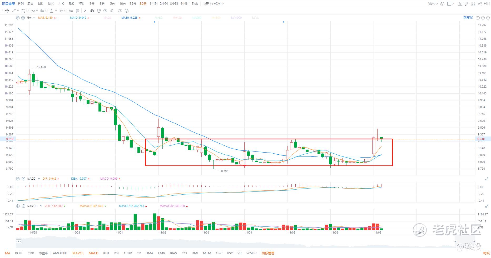 $阿里健康(00241)$ 今天可能会出现建仓机会,所以盯紧一点。建仓逻辑是日线上连续大跌30%后已处于超卖状态,而近几天连续企稳,今天有机会来个饱满阳线,正式形成底分型的二次确认从而开始反弹。细化到30分钟级别可以看的更清楚这几天的企稳状态,而我们现在需要等的就是30分钟的一个饱满阳线,确认当前底部盘整区间的突破,现在就耐心等待即可。