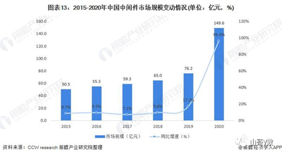 基于此,前瞻对中国2019-2020年中间件市场规模进行了填补。统计数据显示,中国中间件行业市场规模呈现逐年上升趋势,在信创产业建设概念提出前,中国中间件市场规模保持8%左右的增长率稳定增长,2020年其增长速度较快,达到96.4%,市场规模达到149.6亿元。