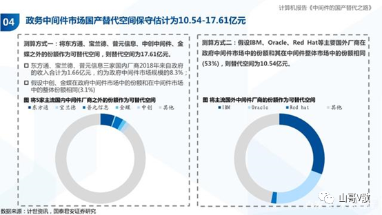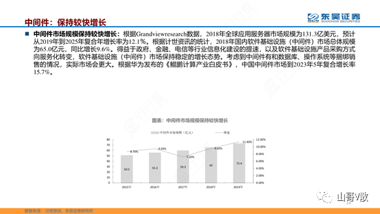 政务应用信创的服务器规模是办公信创10倍以上,重要行业信创服务器规模又是政务应用信创10倍以上,中间件作为服务器端三大核心软件(操作系统、数据库、中间件)之一,国内存量市场200~300亿,每年新增市场13亿美金,过去都是IBM和Oracle,未来空间很大。