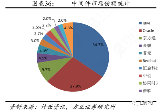 国际市场上的主要中间件厂商包括IBM,Oracle,Salesforce,Microsoft 和Amazon。IBM、Oracle占据国内中间件市场绝对领先地位,两者市占率超过50%。