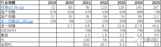 假设国外厂家退出一般市场,从62.6%到31.3%, 5年完成37.4%到70%的国产化率,为5年CAGR 38%。