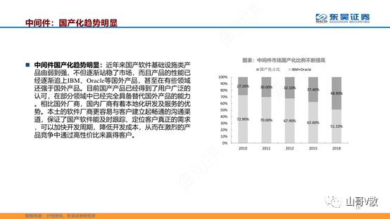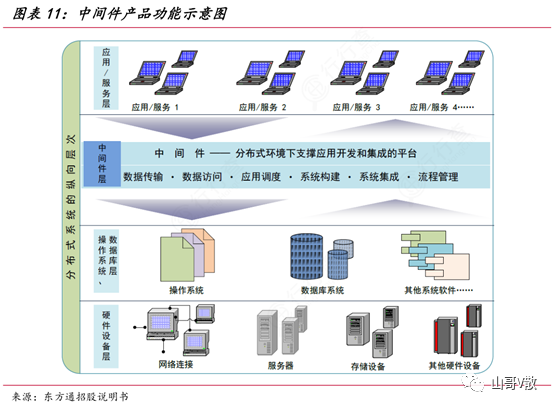 中间件是一种应用于分布式系统的基础软件,位于应用与操作系统、数据库之间,主要用于解决分布式环境下数据传输、数据访问、应用调度、系统构建、系统集成和流程管理等问题,是分布式环境下支撑应用开发、运行和集中的平台。应用服务器是应用最广泛的中间件,国产化业务主要面向应用服务器。目前,多家中间件公司已进一步向上层应用业务打造了平台化和中台化业务以满足客户数据平台一站式建设的需求。