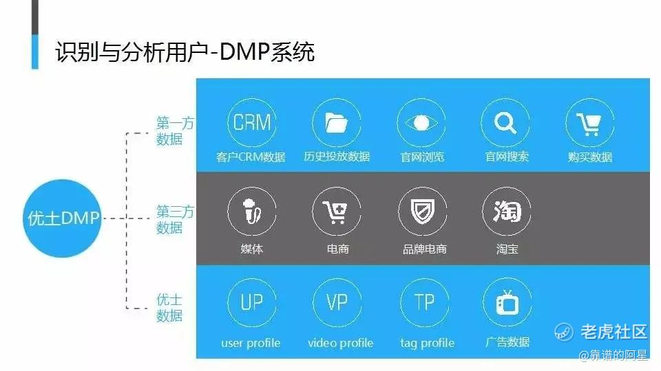 睿视对外介绍称“专注于优酷和土豆的视频广告自主投放的程序化营销平台”,由于优酷土豆本身属于阿里系旗下的大文娱板块,其DMP数据除了有产品端形成的用户数据外,还包括阿里巴巴的电商以及产品通过淘宝或者支付宝账户打通的用户画像。