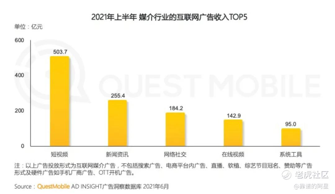 据QM数据显示,2021年上半年在线视频行业广告投放高达142.9亿元,这其中主要是以腾讯视频、爱奇艺、优酷等为主;落后于短视频上半年503.7亿投放,以及新闻资讯端255.4亿元。