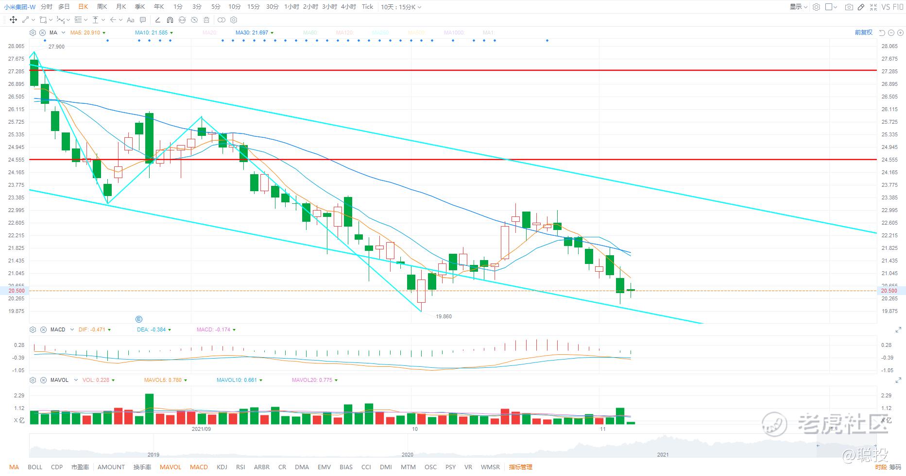 小米今天相对较弱,昨天虽然在下边轨处体现了支撑,但是没给出底分型之前还是不能贸然介入的,再耐心等一下比较好。