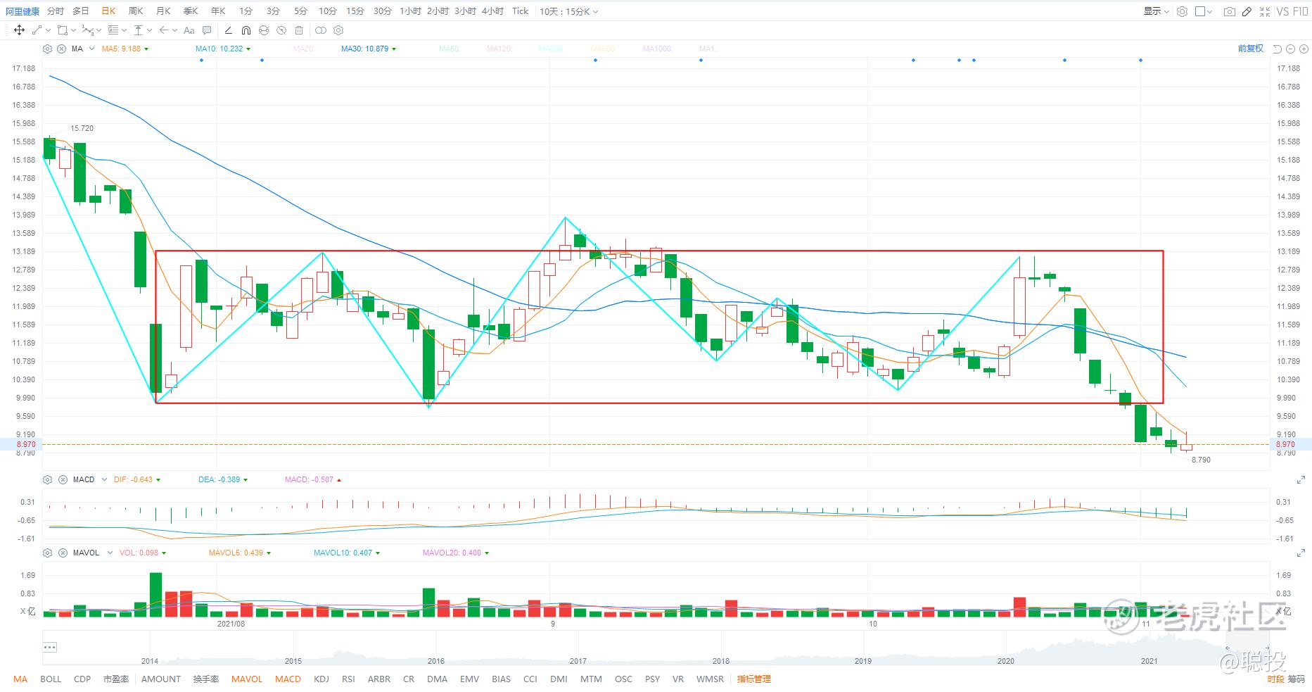 阿里健康冲高后回落,但愿没有股友贸然追进去,这个地方一定要等日线的底分型和二次确认,千万不要小看十连阴的下跌力度,仅凭30分钟的底分型恐怕很难让它止跌,继续等待。