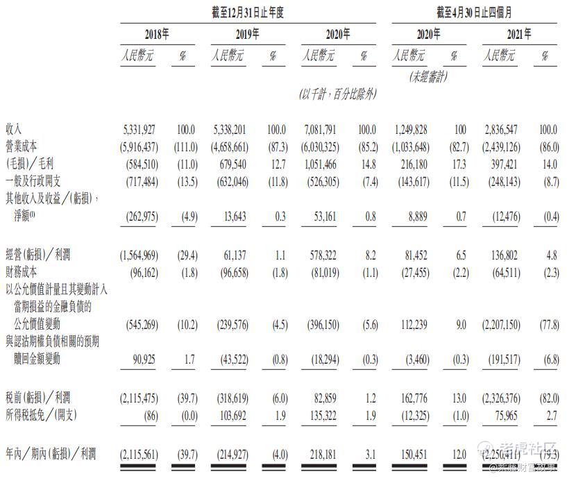 财务数据方面,2018年、2019年、2020年及截至2021年4月30日止四个月,公司实现收益分别约为人民币53.32亿元、53.38亿元、70.82亿元及28.37亿元;2020年获得净利润约为2.18亿元,2018年和2019年分别产生净亏损约为21.16亿元和2.15亿元;截至2021年4月30日止四个月,产生净亏损约为22.50亿元。