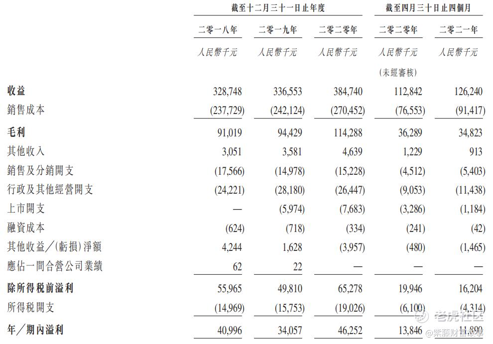 财务数据方面,2018年、2019年、2020年及截至2021年4月30日止四个月,公司实现收益分别约为人民币3.29亿元、3.37亿元、3.85亿元及1.26亿元;同期溢利分别约为人民币4099.6万元、3405.7万元、4625.2万元及1189.0万元。