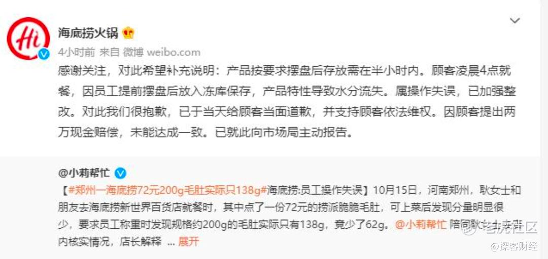 最近,海底捞因为200g毛肚缩水事件被刷上热搜。