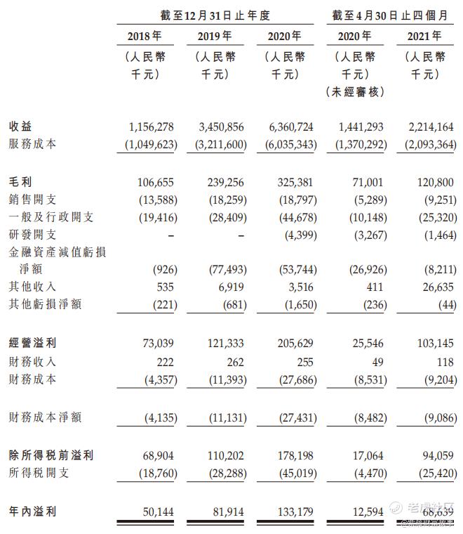 财务数据方面,2018、2019、2020年度及截至2021年4月30日止四个月,公司的收益分别分别为11.56亿元、34.51亿元、63.61亿元及22.14亿元;同期净利润分别为0.50亿元、0.82亿元、1.33亿元及0.69亿元。
