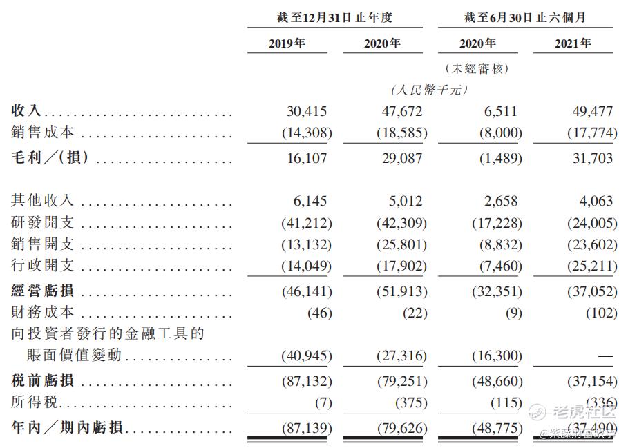 财务数据方面,公司尚未实现盈利,并于往绩记录期间均产生净亏损。2019年、2020年以及2021年上半年,公司实现收入3041.5万元、4767.2万元及4947.7万元;同期净亏损8713.9万元、7962.6万元及3749.0万元。