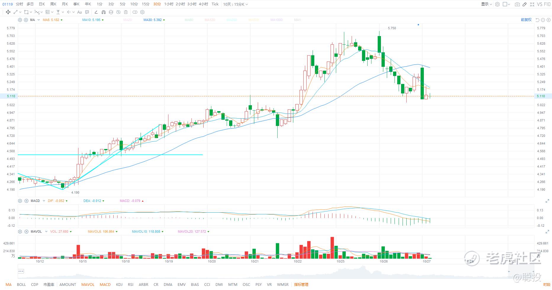 1、$创梦天地(01119)$ (中线):创梦今天随大势继续回调,但幅度还好,没什么问题。消息面上,昨天公司公告了与腾讯的进一步合作,并且第二家线下店也将于10月29号在深圳龙华壹方天地正式开业。所以阿聪仍然继续看好它,至于它的短期波动,还是那个策略,想做T的可以按阿聪说的方法在30分钟上反复做T 降成本,不想做T的耐心持有即可。