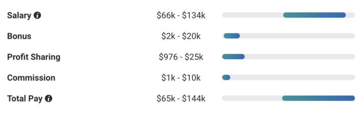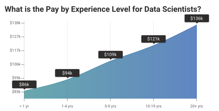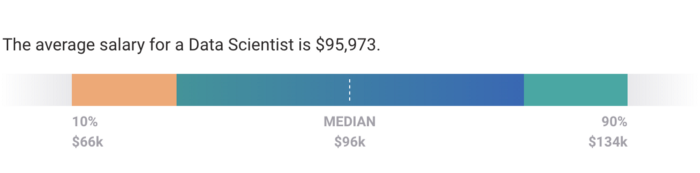 PayScale(一个薪资洞察平台)上检索到的结论是,数据科学家的当前中位数工资为95,973美元,浮动范围从66k到134k。(注意,这是全美所有公司的中位数,如果你只看科技大厂的话,其薪水会比这个数字大很多。)