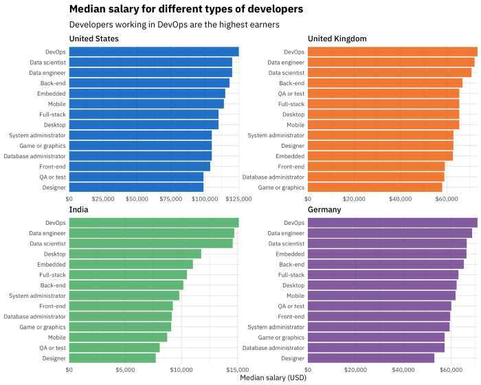 我们能从图中发现,不同职位角色的薪酬高低会因国家/地区而异。但数据工程师和数据科学家在每个收集数据的国家/地区中都上榜了前三位。数据角色如此稳定的排名背后的意义就是:所有国家都在同等程度上要求和重视数据科学家!