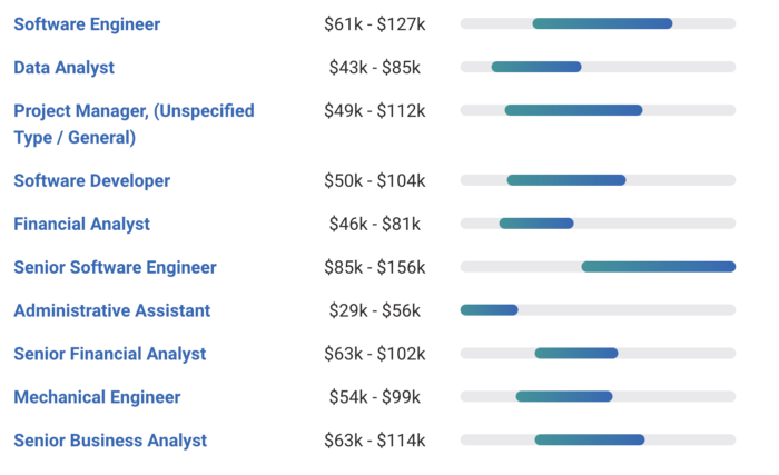 这份清单为我们清楚地描述了类似职业的薪资范围。可以看到,数据科学家的薪水比高级软件工程师的还要高出10,000美元。同样的,数据科学家的工资中位数也显著的高于列出的每个职业,很令人惊讶是吧?
