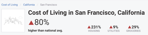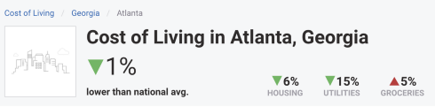 而且如果你仔细看两张图右下角的数据就会发现:亚特兰大在每一项生活成本上都要便宜得多!让我们来做个详细计算:全国平均租金:$1,468。亚特兰大:$1380 ,旧金山:$3392。乘上12个月,那么每年光是房租的净差额就有24,144美元!更不必提其他诸如水电费,食物,和日用品的费用(这些费用在两个城市之间的差异也很大)。因此,当你在拿到了一份六位数薪资的工作之后,请仔细算算账,确保它带给你的购买力真的是六位数薪资的水平!