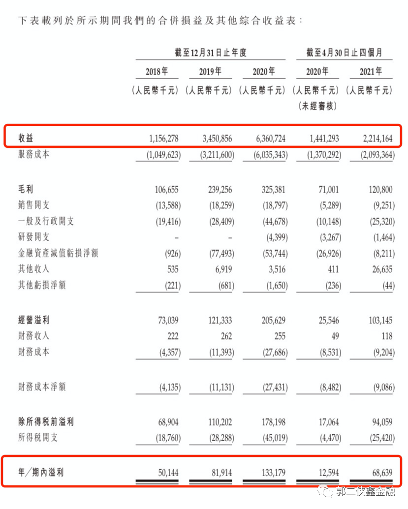 财务数据显示,2018财年至2020财年公司总营收分别为人民币11.56亿元、34.51亿元及63.61亿元,复合年增长率达134.5%;同期录得净利润5014.4万元、8191.4万元及1.33亿元,复合年增长率达63.0%。