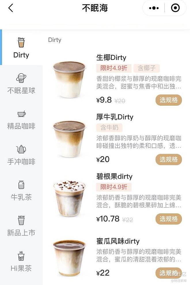 目前,打开“不眠海”小程序可以看到Dirty系列已增至4款,除上述两款新品,还有生椰Dirty和厚牛乳Dirty。这一数量在其他连锁精品咖啡馆也不多见,通常只会准备一两款,或以季节限定的形式不定时推出新品,比如Seesaw曾推过糖葫芦Dirty和蜀茶花冻Dirty。而星巴克、瑞幸等大众连锁咖啡馆,Dirty基本不会在菜单上出现。
