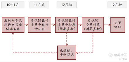 如下图所示,美联储主席一般需要经历以下三个流程,首先每年10-11月由总统向参议院递交书面提名名单,然后在11月底-12月初,需要经过国会批准,这一投票将以简单多数通过,获得50票支持即可。如果无法通过,提名将会退还给总统,重新考虑人选。最后一个流程则是第二年2月初宣誓就职。