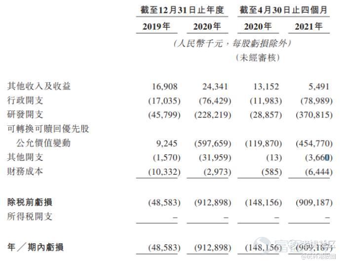 公司于2019年、2020年,公司分别录得净亏损4858.3万元、9.13亿元;于2021年前四个月,净亏损9.09亿元,三年累计亏损18.5亿。