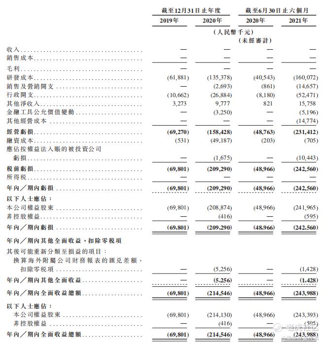 财务数据方面,于往绩记录期间,公司并无产生任何收入或任何销售成本,其原因是其产品仍处于开发阶段,并产生经营亏损。公司在2019年、2020年及2021年上半年,分别录得亏损净额人民币6980.1万元、2.09亿元及2.43亿元,主要由于公司的研发成本及行政开支所致。