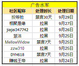 大家好!下午小管家通报了一批本月被拉黑的水军账号⚠️9月社区违规账号清查通报,接下来,管家继续通报本周违规用户名单: