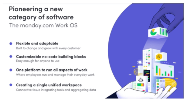 Monday是以色列一家基于云计算的协作工具的公司,它提供了一个基于云的Work OS,也就是可视化操作系统,可以通过无代码平台快速构建工作流程和项目,组织构建软件应用和工作管理工具来满足各种需求。