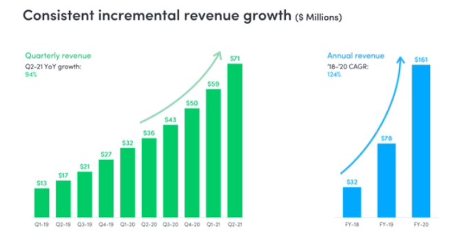 自2018年以来,该公司的收入一直以124%的复合年增长率增长。2021年第一季度末和第二季度末,收入分别同比增长85%和94%。对于2021年全年,管理层预计收入将在2.8亿美元至2.82亿美元之间,同比增长74%至75%。