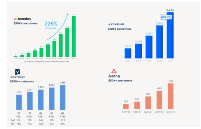 背靠这些大客户,Monday的增长速度要明显快于其他竞争对手。