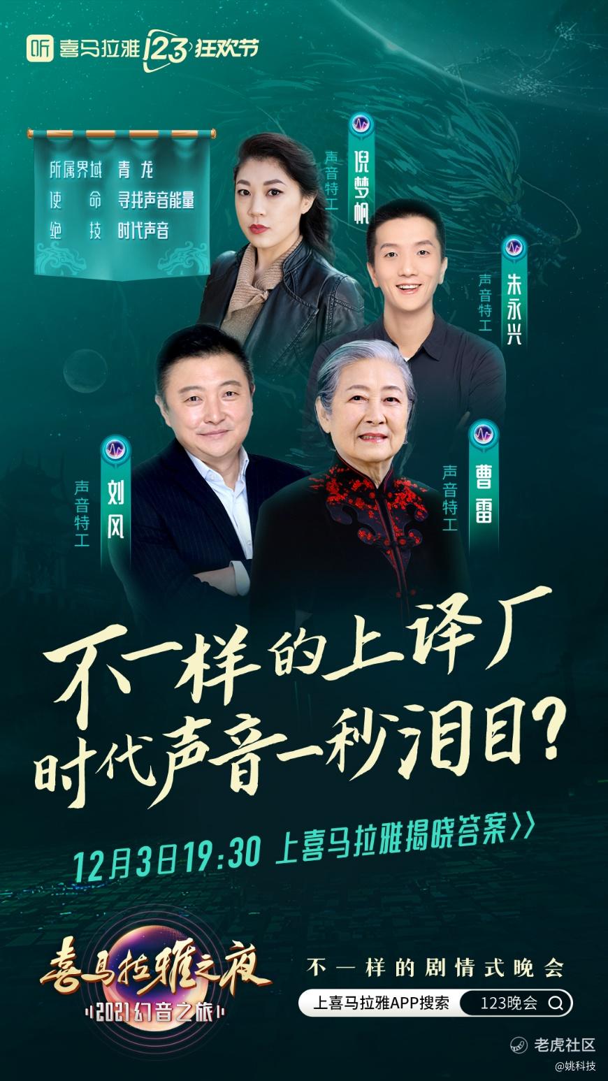11月22日,《喜马拉雅之夜·2021幻音之旅》晚会第二批参演阵容揭晓。陈军、方浩然、HENRY刘宪华、杨柳、张泽、上海电影译制片厂配音演员曹雷、刘风、倪梦帆、朱永兴等将参加晚会“青龙“篇章的演出。